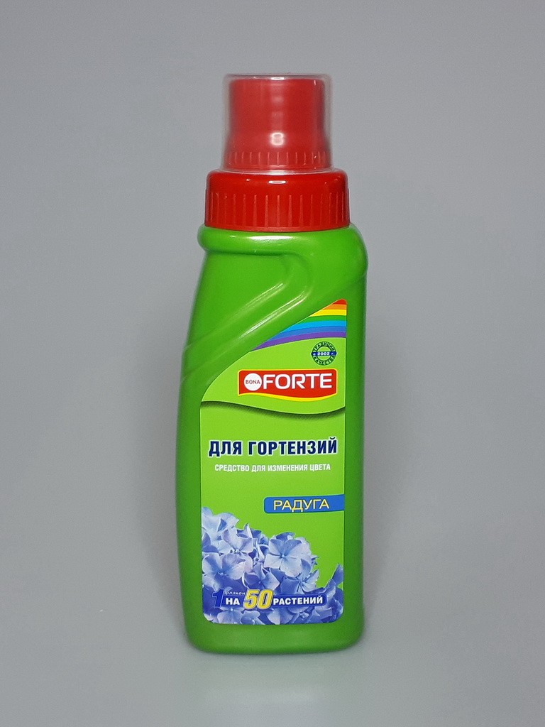 Концентрированное средство Bona Forte "Радуга" используется для изменения и поддержания голубого цвета крупнолистных гортензий.Действие средства • изменяет цвет цветущих гортензий с розового на голубой;• поддерживает яркий насыщенный голубой цвет соцветий;• улучшает внешний вид крупнолистных гортензий.
